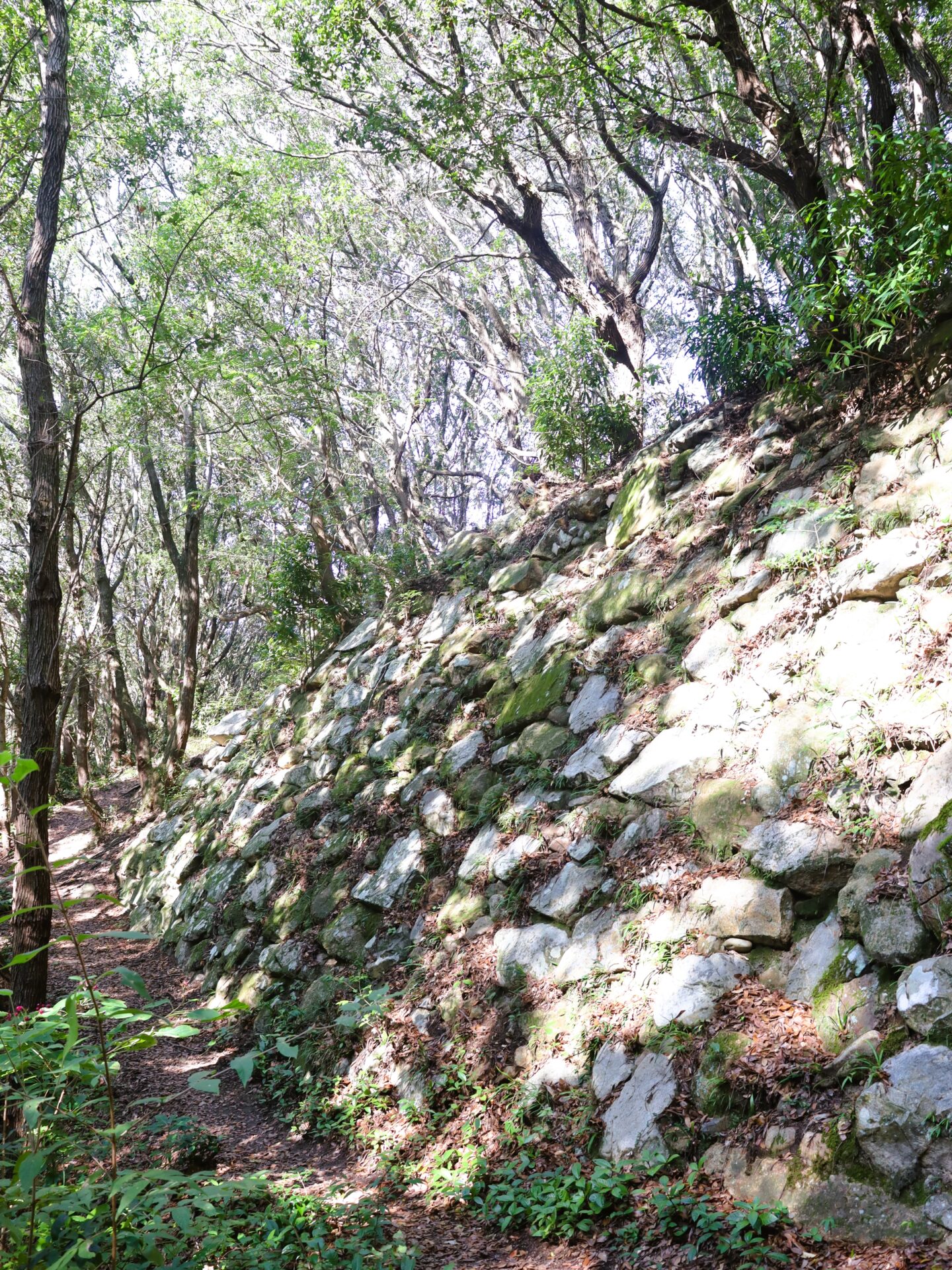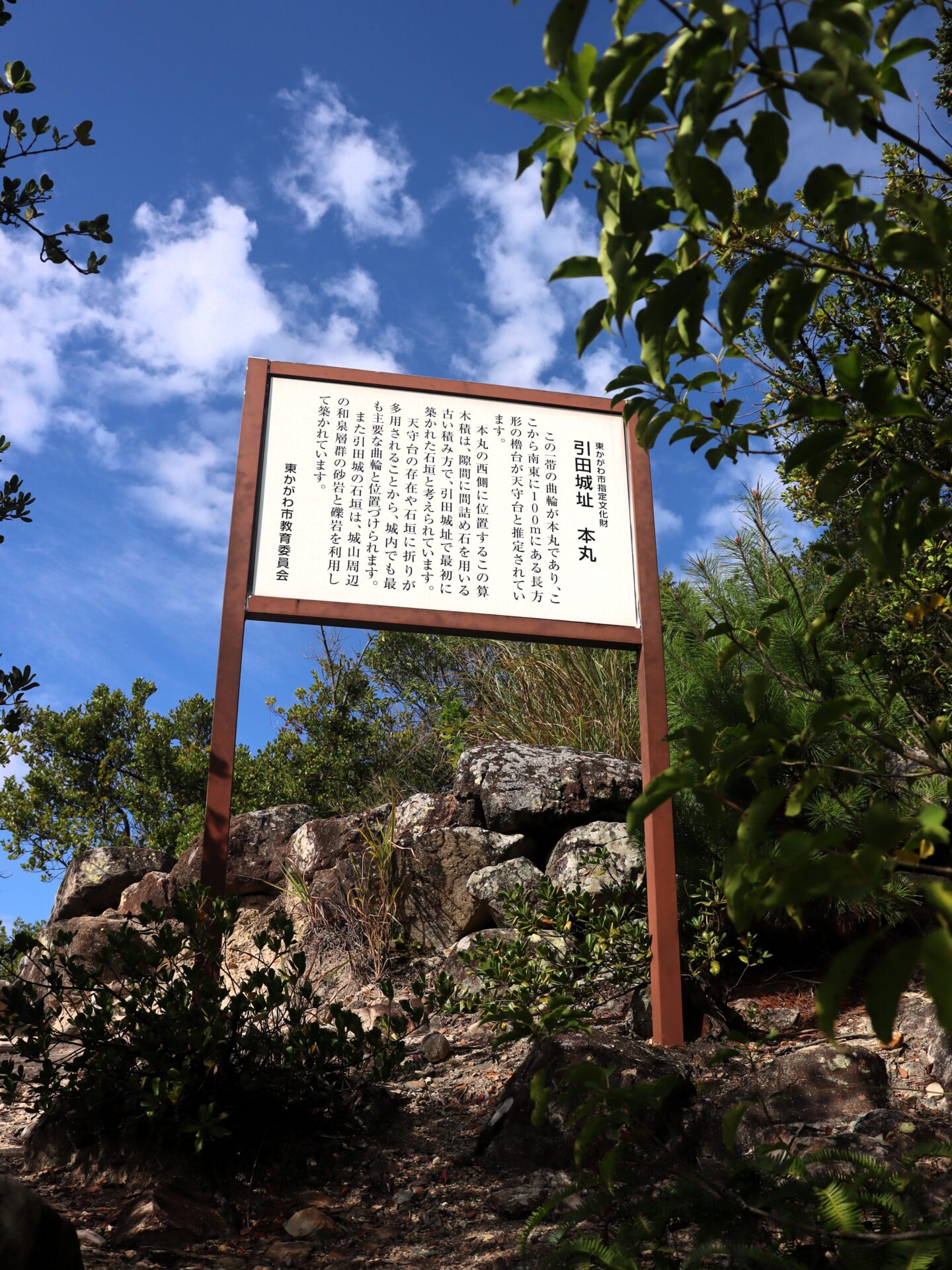 現在は生駒氏が築いた自然石を積んだ野面積の石垣が残されており、往時の威容を感じることができます。建物の礎石やたくさんの瓦も見つかっています。城山の高さは82メートルであり、頂上からは引田のまち並みや瀬戸内海が眺められます。