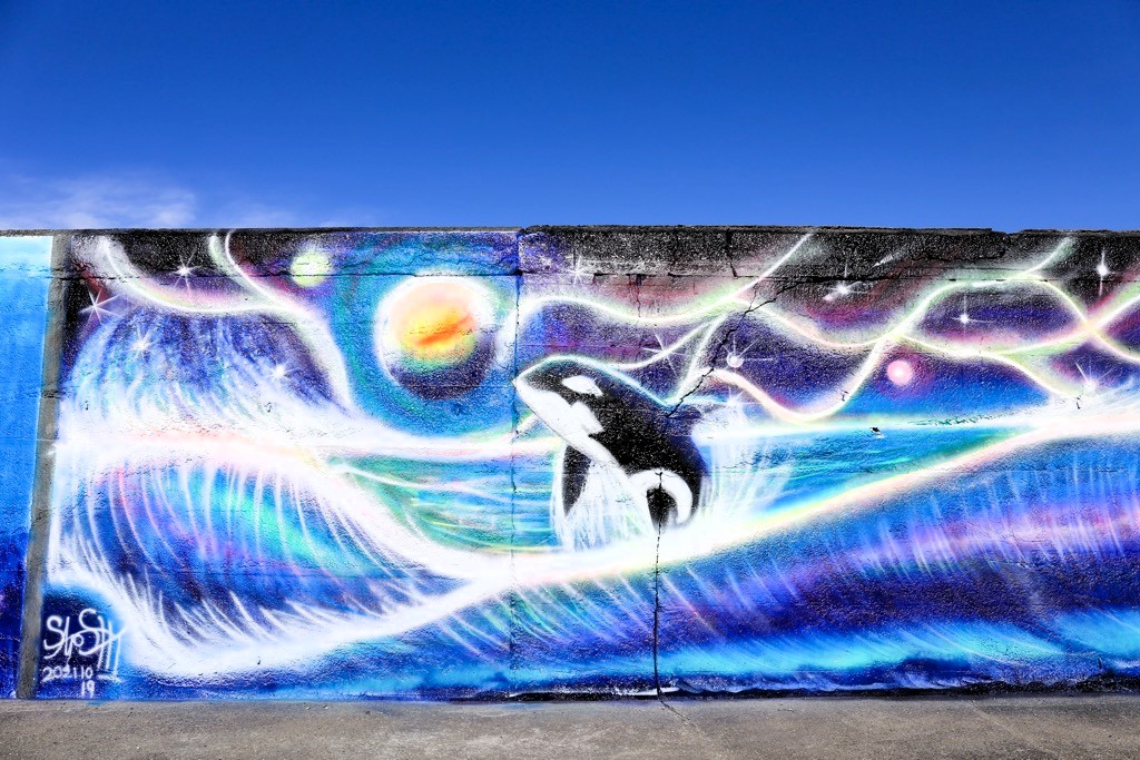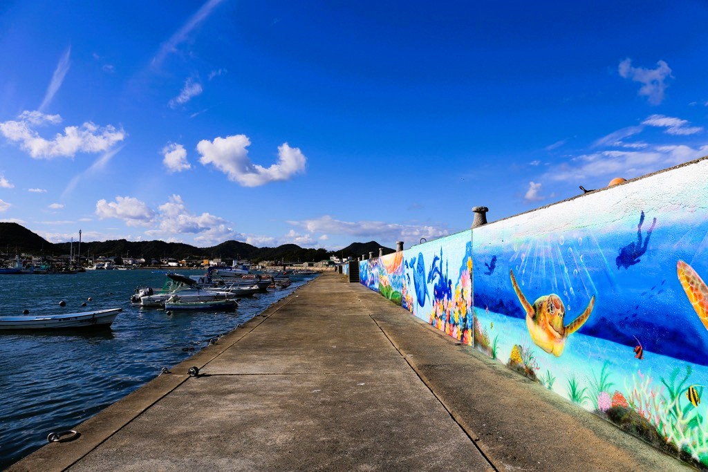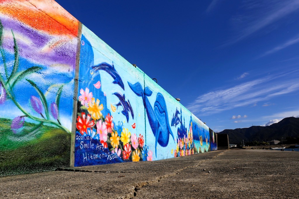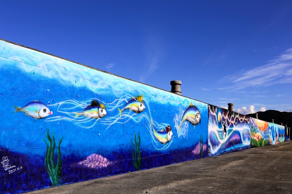 このまま放置しては…ということで、「東かがわ市湾岸アートプロジェクト」を立ち上げました。壁画の修復に加え、新たに県内外のアーティストを招き、オーシャンビューなスポットに作品を描いてもらいました。