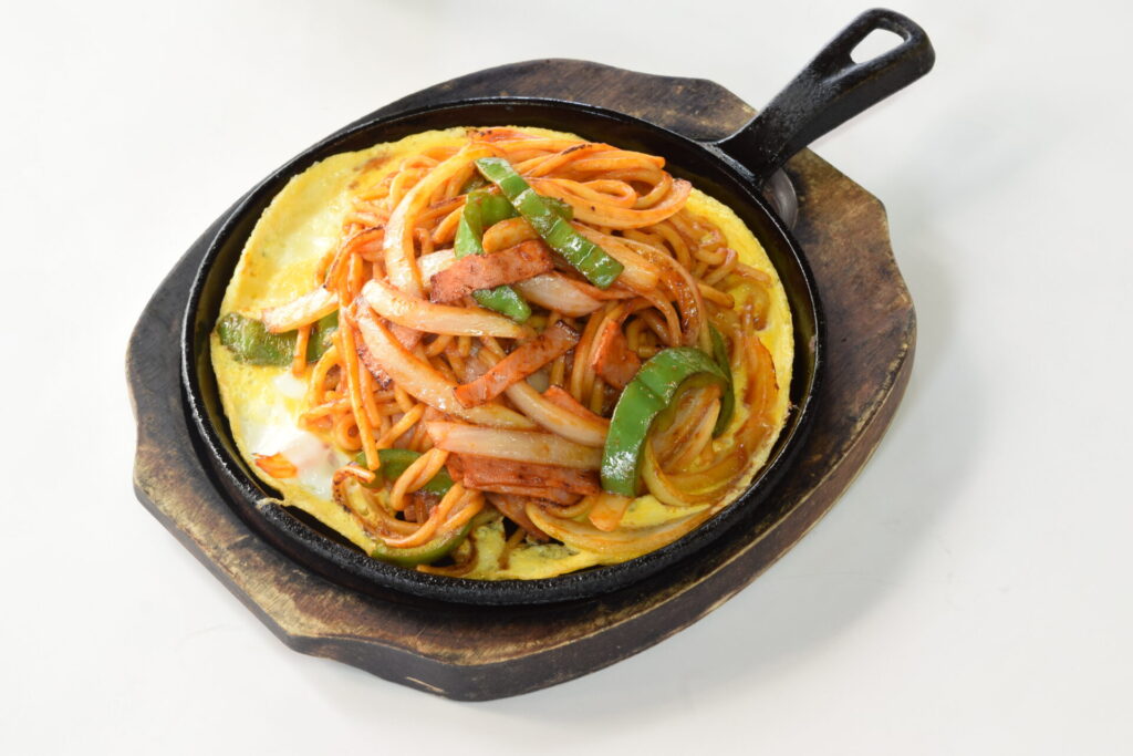 鉄板に卵を敷き、モチっとした太麺のスパゲッティをのせた一品。自家菜園で育てたタマネギとピーマンはシャキシャキ食感!