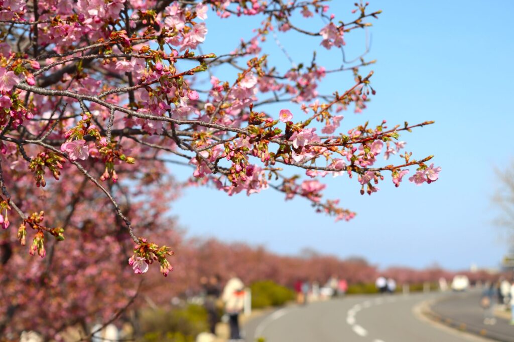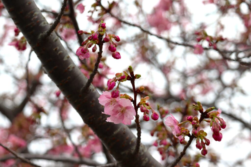 開花した花も、河津桜ロード全体で30輪ほどに増え、彩りも少しずつ広がりつつあります。