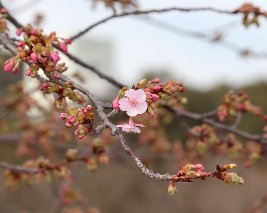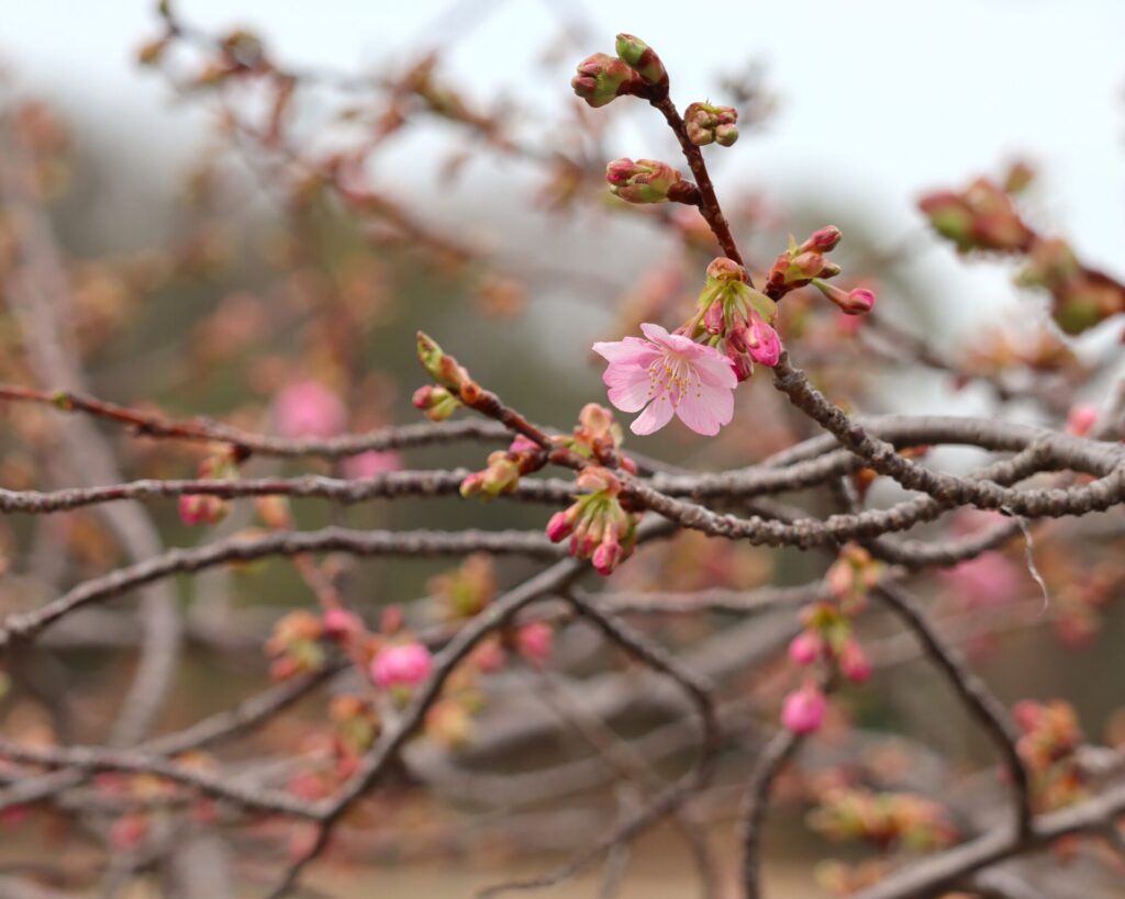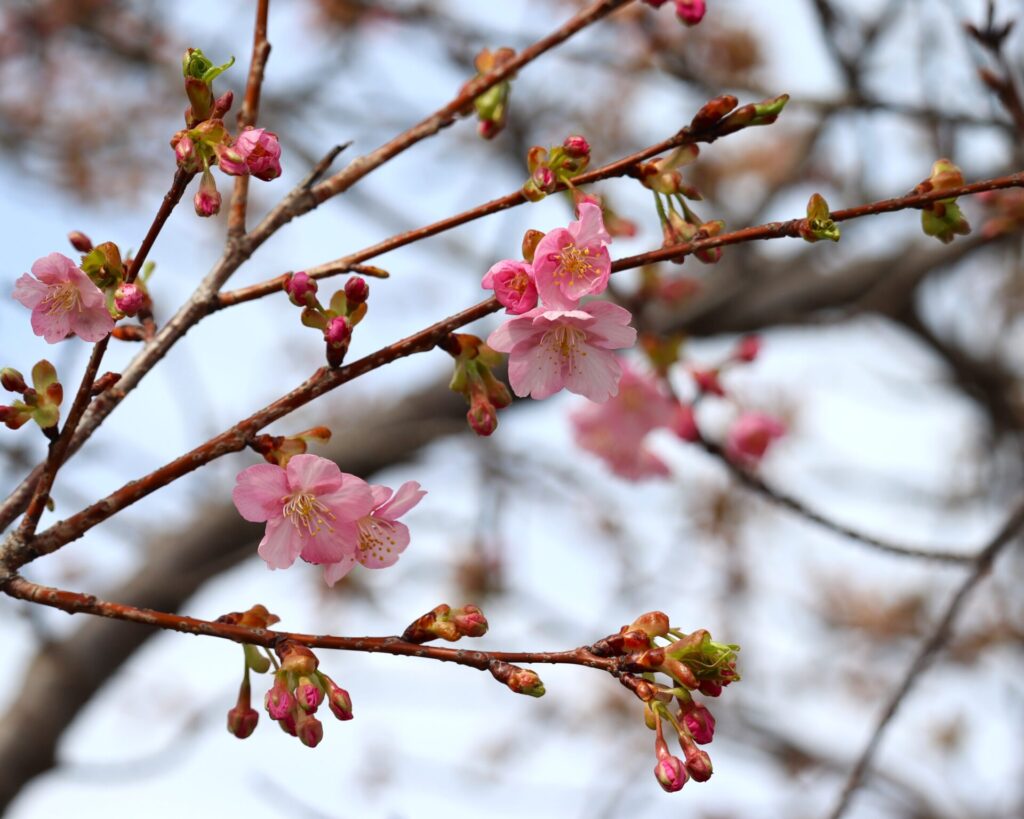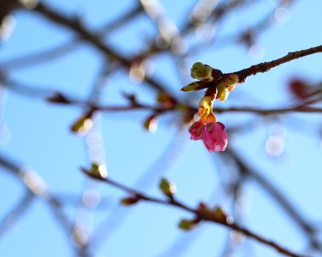 これまで枝先でふくらんでいた蕾がほころび、鮮やかなピンク色の花が少しずつ増えてきました。