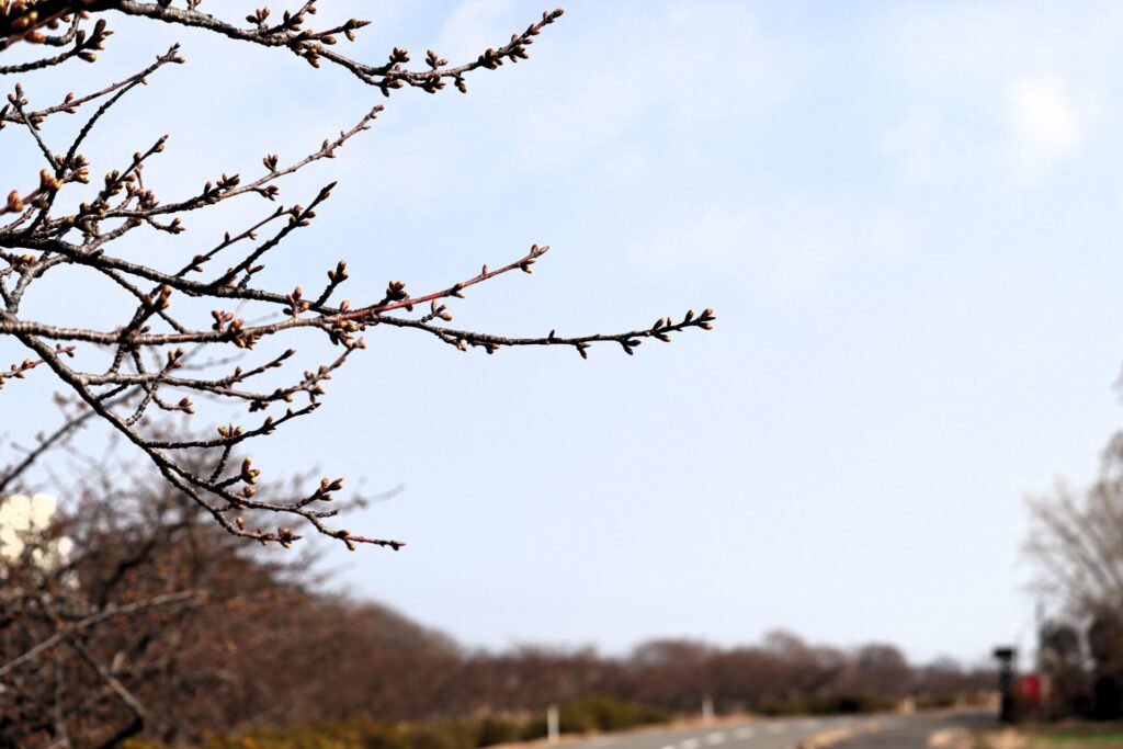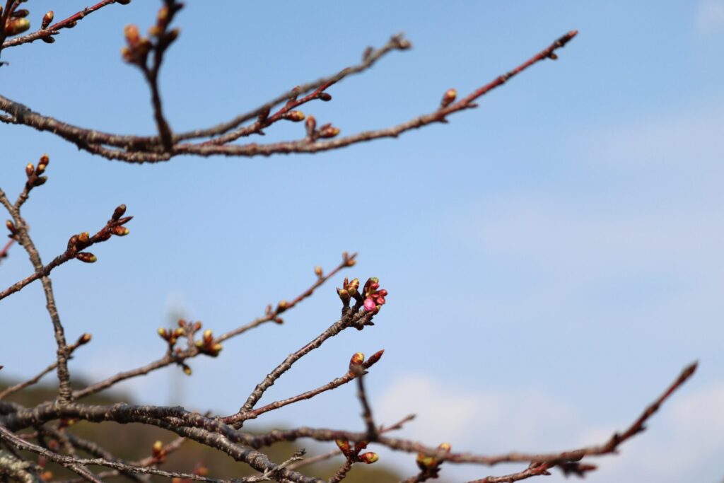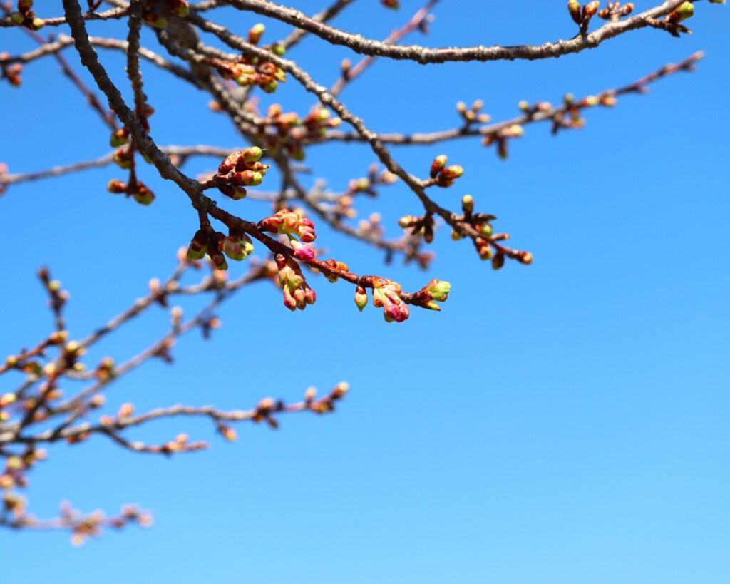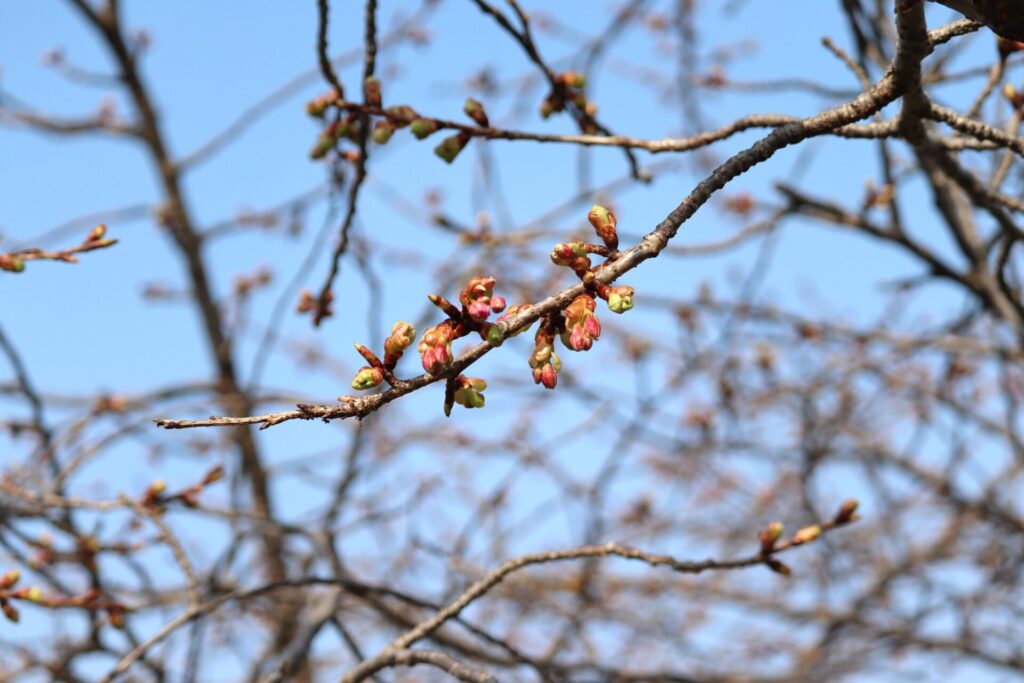 近づいてよ~く観察してみると、ふくらみはじめた蕾がやわらかな春色をのぞかせているものや